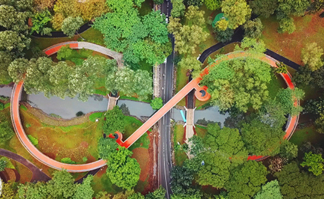 The Infinity Link Bridge is designed to connect the north and south parks previously separated by Jalan Tebet Timur. This six-meter-high bridge stands between towering existing trees, which makes the bridge seem to be hugged by a lush green canopy. The vegetation surrounding the Infinity Link Bridge is designed with various color tones inspired by the Leda tree (Eucalyptus deglupta Blume).