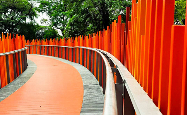 This zone, located under the Infinity Link Bridge, escorts and welcomes visitors going up/down from the Infinity Link Bridge. This park area is intended for art installations by local artists and is used as a photo spot. The circular floor pattern is used as an area for displaying fragrant plants and also as an area for art installations.