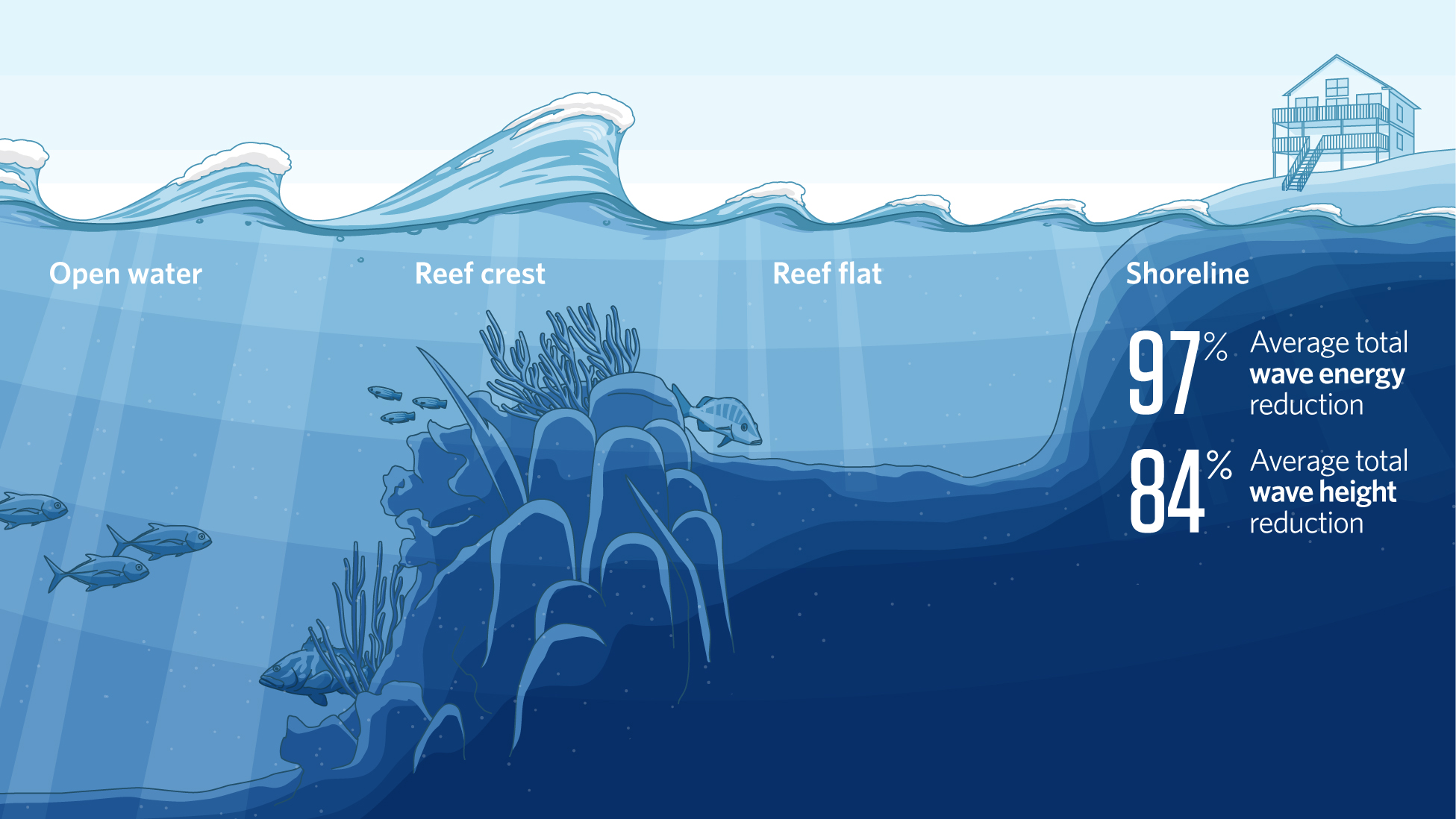 Jika hutan bakau melindungi dari pesisir, terumbu karang melindungi pantai dan ekosistemnya dari tengah laut. Terumbu karang berperan sebagai penyangga dan pemecah gelombang alami yang meminimalkan energi dahsyat gelombang laut.